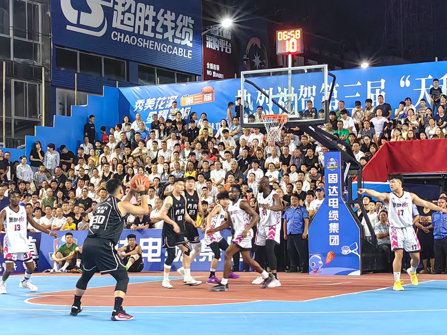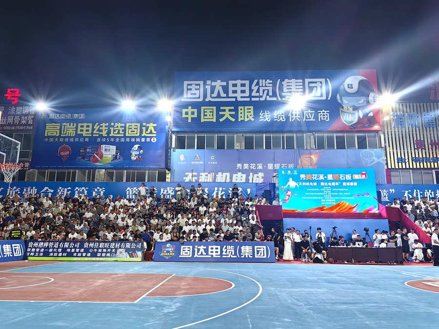 8月26日晚8:00,贵阳花溪区石板镇摆勺村天利机电城A4栋篮球场上欢呼不断、气氛热烈。第三届“天利机电城·固达电缆杯”篮球联赛在激昂的旋律和全场的期待中拉开帷幕。